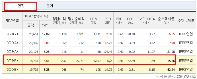 - 매출액: 2021년 20,651억 원 → 2024년(E) 18,715억 원 (약 9.3% 감소)