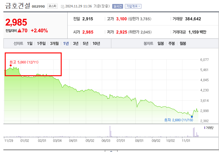 2024년 11월 29일 기준, 금호건설의 주가는 전일 대비 2.92% 상승하며 3,000원을 기록했습니다. 올해 11월 초 최저점(2,680원) 이후 반등하는 모습을 보이고 있습니다.