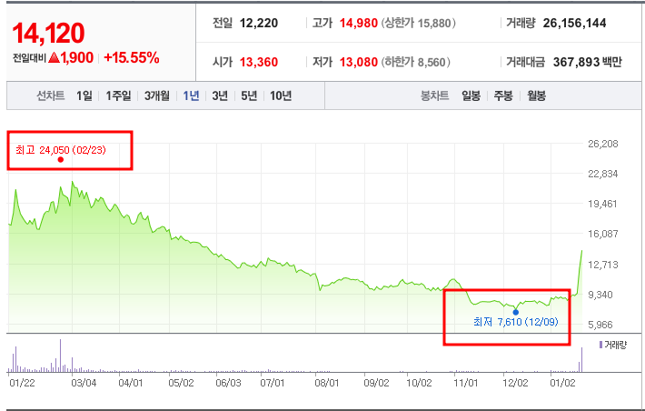 - 최근 1년 최고가: 24,050원 (2024년 2월 23일)