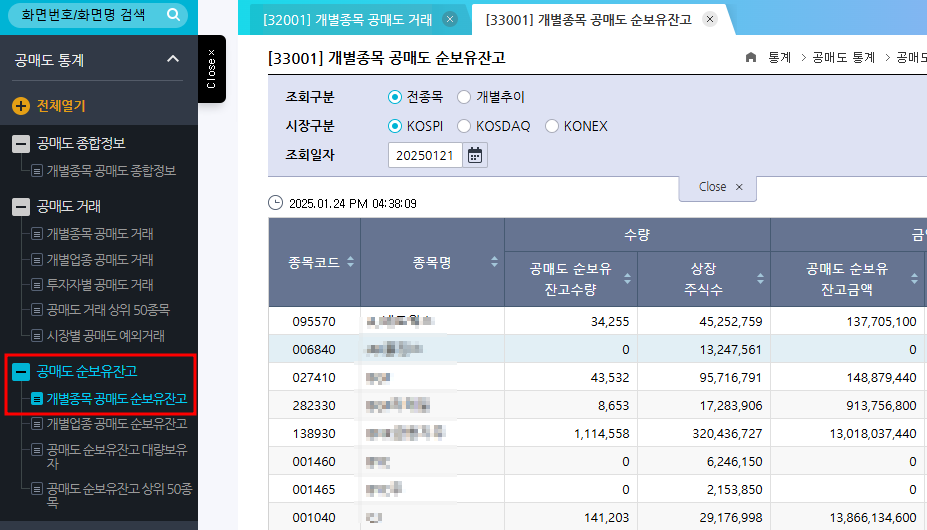 - "통계 - 공매도 통계" 메뉴 선택