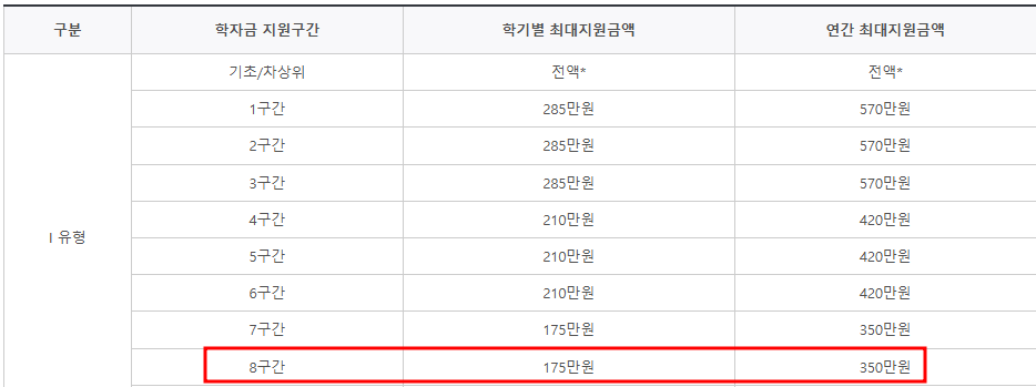 이제 나의 학자금 지원구간을 확인했다면 과연 장학금을 얼마나 받을 수 있는지 궁금해집니다. 국가장학금이 소득수준과 연계해서 소득이 낮은 학생에게 더 많은 혜택이 가도록 설계되어 있어 지원구간이 낮을 수록 장학금 지급금액도 커집니다. 작년까지 국가장학금을 받을 수 있는 최저 구간이었던 소득분위 8구간 지급금액은 학기별 175만원, 연간 350만원까지 받을 수 있습니다.