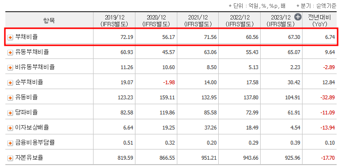 부채비율 67.30%는 업계 평균을 크게 밑도는 수준으로, 추가적인 투자 여력과 경기 변동에 대한 안정성을 나타냅니다.