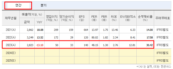 - 2023년: 예상 매출액은 2,823억 원으로 감소하였고, 영업이익은 50억 원, 당기순이익은 34억 원으로 소폭 회복세를 보일 전망입니다.