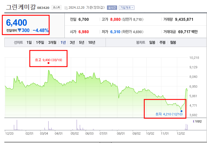 2024년 12월 20일 기준, 그린케미칼의 주가는 전일 대비 4.48% 하락한 6,400원을 기록하며 약간의 조정을 보였습니다. 하지만 한 달 전 최저가인 4,210원에서 크게 반등하며 강한 상승세를 이어가고 있습니다.
