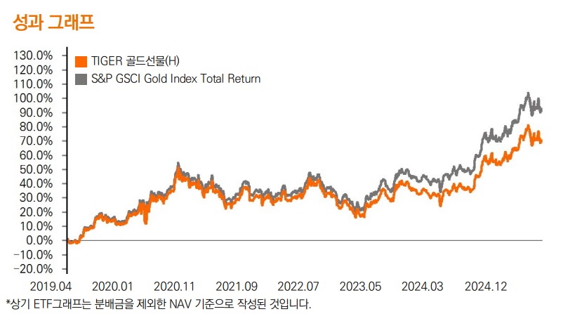 TIGER 골드선물 ETF 역시 금 선물을 기초자산으로 하는 상품으로, 연초 이후 8.28%의 수익률을 기록하며 꾸준한 성과를 보여주고 있습니다.