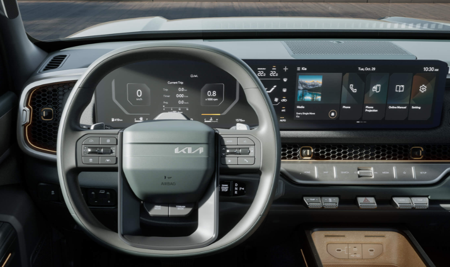타스만의 실내는 현대적이면서도 실용적인 디자인으로 구성되었습니다. 12.3인치 디스플레이와 5.0인치 공조 디스플레이가 함께 구성된 파노라믹 와이드 디스플레이는 운전자 편의성과 기술적 우수성을 반영하고 있으며, 고급스러운 하만카돈 8스피커 오디오 시스템을 통해 프리미엄 음향을 제공합니다. 기아는 또한 OTA(무선) 소프트웨어 업데이트 기능을 제공해 차량의 최신 상태를 유지할 수 있도록 했습니다.