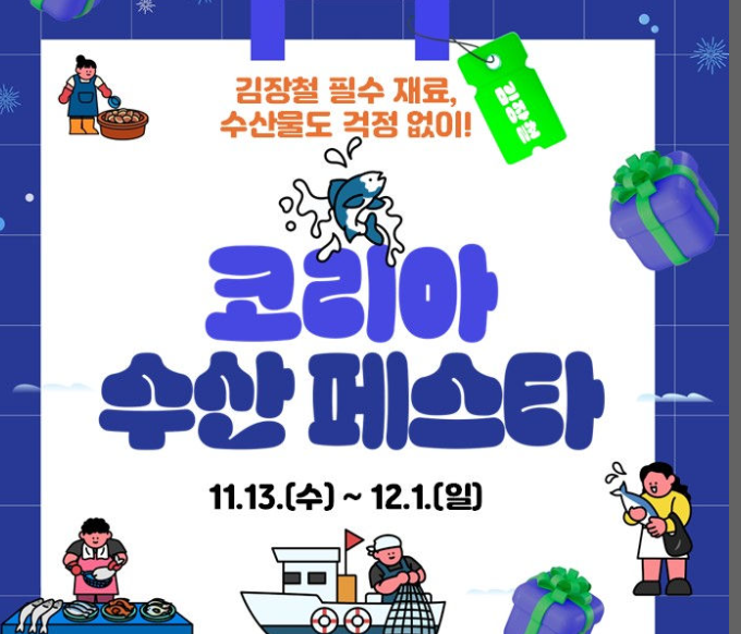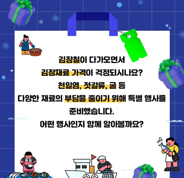 김장철에는 김치와 함께 먹는 수육용 돼지고기도 수요가 높습니다. 이를 위해 한돈자조금을 활용해 국내산 냉장 돼지고기를 20% 할인된 가격으로 공급합니다. 이 외에도 천일염, 젓갈류, 굴 등 수산물도 11월 13일부터 12월 1일까지 최대 50% 할인된 가격으로 판매됩니다.