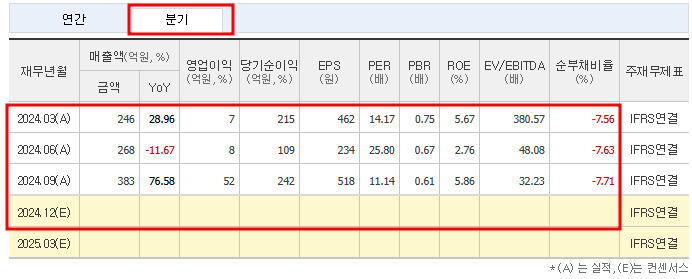 - 2024년 3분기 매출은 383억 원으로, 전년 동기 대비 큰 폭으로 증가했습니다.
