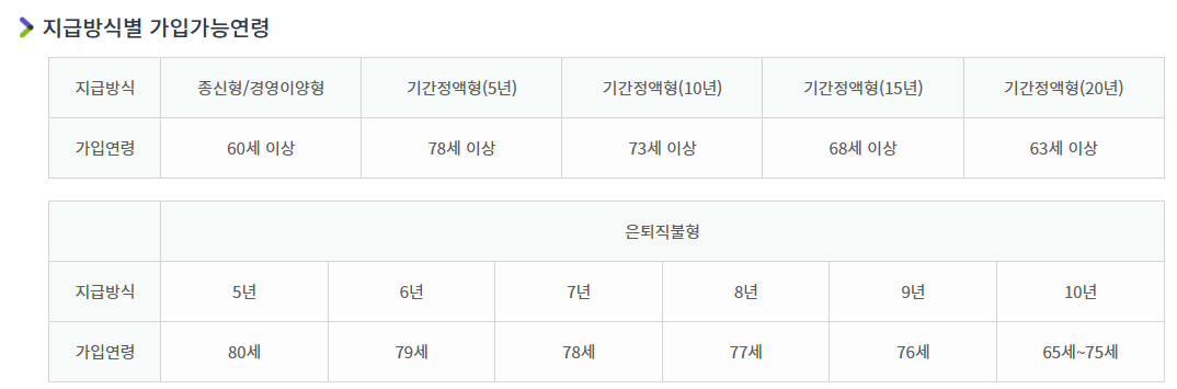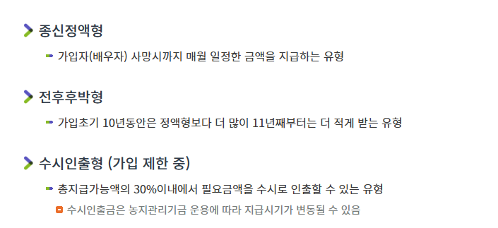 - 기간형: 5/10/15년 중 선택 가능하며, 높은 월수령액이 특징이지만 설정한 기간 이후 지급이 중단됨