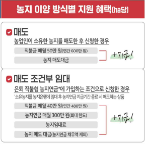 - 농지이양 은퇴직불금(1ha당 월 50만 원).