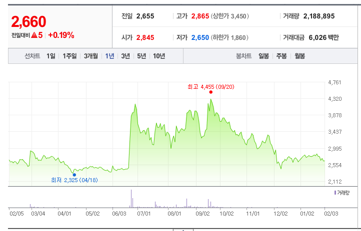 - 52주최고가/최저가: 4,455원/2,325원