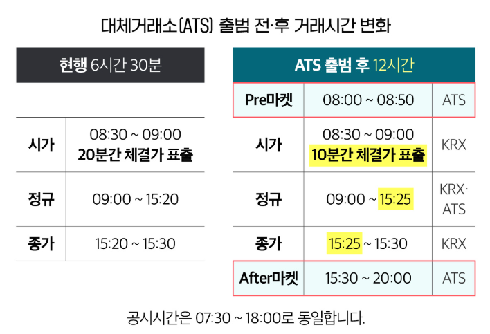 반면 대체거래소는 프리마켓(오전 8시~8시50분), 정규시장(오전 9시~오후 3시20분 또는 3시30분) 그리고 애프터마켓(오후 3시40분~오후 8시)의 3개 구간으로 운영됩니다.
