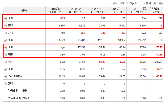 | EPS(원) | -115 | 28 | 267 | 160 | 510 |