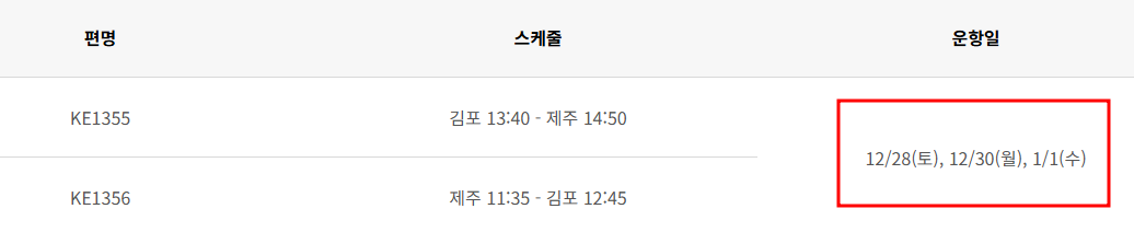 | KE1356 | 제주-김포 | 11:35 | 12:45 | 12/28, 12/30, 1/1 |