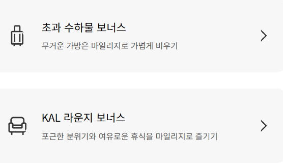 마일리지를 이용해서 여행 중에 필요한 다양한 부가서비스를 이용할 수 있습니다. 초과 수하물 보너스, 반려동물 보너스, KAL 라운지 보너스, 비동반 소아 보너스 이용에 마일리지를 사용할 수 있습니다.