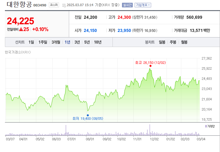 대한항공 주가는 52주 기준으로 작년 8월 5일 최저가인 19,400원을 찍은 후 작년 12월 2일에 최고가 26,150원을 기록했습니다.