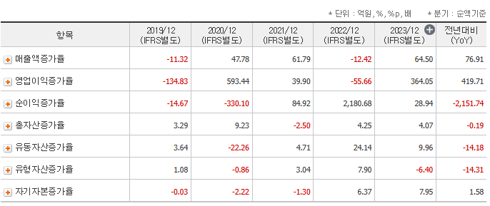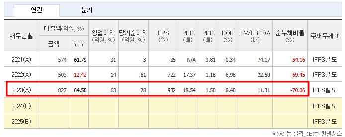 - 2021년 매출액: 574억 원 → 2023년 매출액: 827억 원(64.50% 증가)