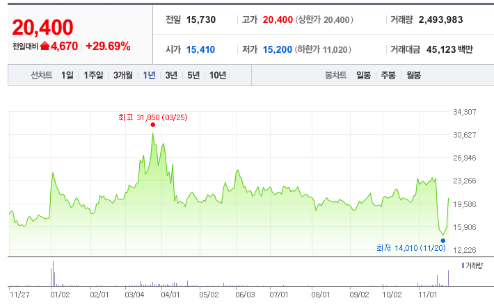 최근 1년간 동신건설의 주가는 2024년 3월 25일 최고가 31,850원을 기록한 후 하락세를 보였습니다. 2024년 11월 20일 최저가 14,010원에서 반등하며 강한 상승 모멘텀을 보여주고 있습니다. 특히, 주가의 급등은 기업 실적, 외부 이벤트 또는 시장의 수급 변화가 영향을 미쳤을 가능성이 큽니다.