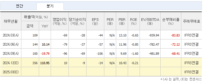 • PER(주가수익비율): N/A (적자로 인해 산정 불가)