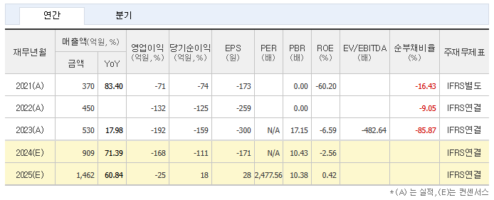 • 2023년(예상): 매출액 530억 원, 영업손실 -192억 원, 당기순손실 -159억 원