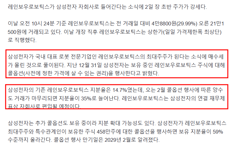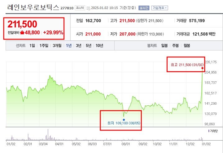 삼성전자에서 지난 12월 31일 레인보우 로보틱스의 지분 35%를 확보하며 자회사로 편입했습니다. 2025년 개장 첫날 레인보우로보틱스 주가는 2025년 1월 2일 기준 211,500원으로 상한가로 급등하며 화제를 모으고 있습니다.