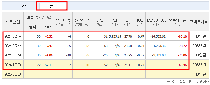 - 1분기: 매출 30억 원, 영업손실 4억 원