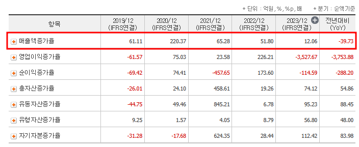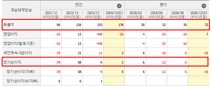 - 2023년: 매출 153억 원, 영업손실 446억 원