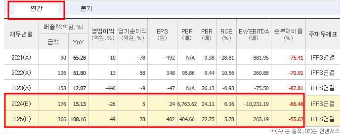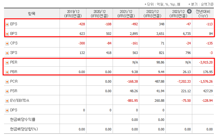 - EPS(주당순이익): 2024년 -1,055원으로 여전히 적자를 기록 중