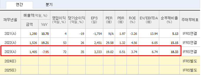 - 2021년 매출액: 1,280억 원 → 2023년 매출액: 1,405억 원