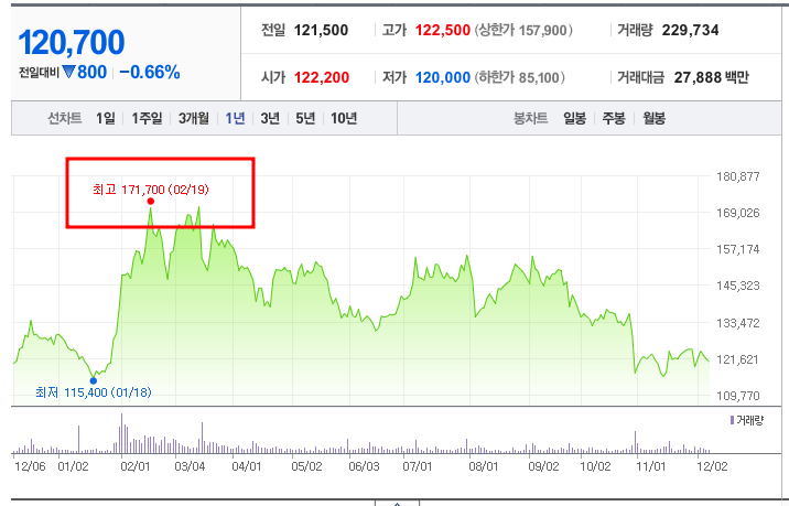 - 52주 최고가/최저가: 최고 171,700원 (2024년 2월 19일), 최저 115,400원 (2024년 1월 18일)
