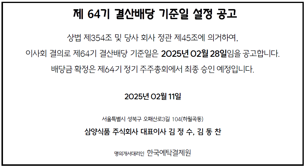삼양식품은 라면 및 식품 제조업을 중심으로 국내외 시장에서 지속적인 성장을 이루고 있는 기업입니다. 이번 2024년 결산배당은 현금배당으로 결정되었으며, 이는 삼양식품의 안정적인 수익성과 재무 건전성을 반영한 결과입니다. 삼양식품은 지속적인 배당 정책을 통해 주주 가치를 제고하고 있으며, 이번 배당도 주주 환원의 일환으로 결정되었습니다.