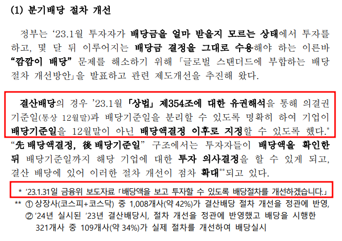 실제로 이 정책은 이미 시행되고 있습니다. 2023년부터 일부 대기업과 금융기업들이 선배당 후투자 제도를 도입하기 시작했고, 2024년에는 더 많은 기업들이 이 제도를 채택하고 있습니다. 코스피200 기업 중 3분의 2, 금융업종의 95% 이상이 정관을 변경했다고 하니, 꽤 빠른 속도로 확산되고 있는 것 같습니다.