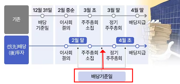 먼저, '선배당 후투자'란 무엇일까요? 간단히 말해, 배당금을 먼저 결정하고 나서 투자자들이 주식을 사도록 하는 방식입니다. 기존에는 연말에 주주를 확정하고 이듬해 3월 주주총회에서 배당금을 결정했는데, 이제는 순서가 바뀌는 거죠.