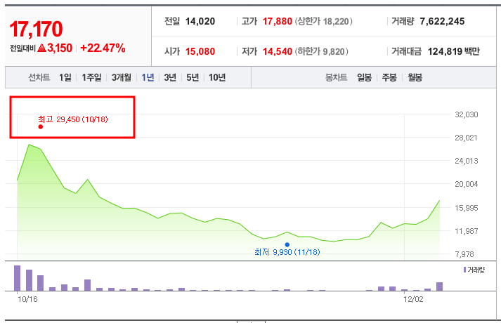 • 52주 최고가/최저가: 최고 29,450원(2024년 10월 16일), 최저 9,930원(2024년 11월 18일).