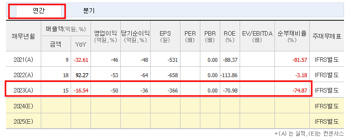 • 2023년 매출: 15억 원, 영업손실 50억 원(추정).