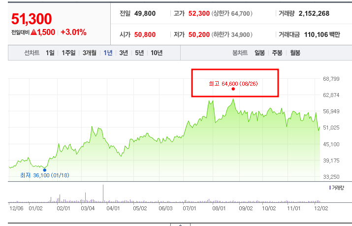 - 52주 최고가/최저가: 최고 64,600원(2024년 8월 26일), 최저 36,100원(2024년 1월 18일).