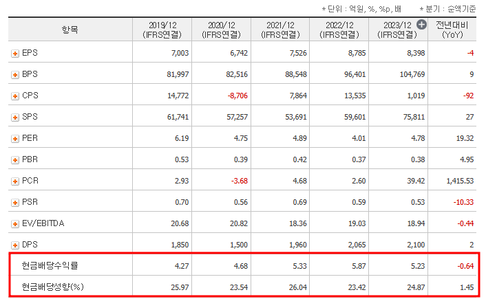 - 2024년 배당금: 2,160원, 예상 배당수익률 4.09%.