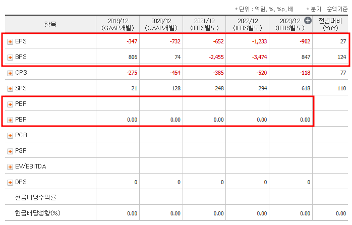 - EPS(주당순이익): 최근 EPS는 -902원으로 적자가 지속되고 있는 상황입니다.