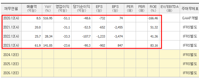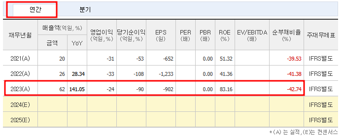 - 2023년(E): 매출액 62억 원, 영업손실 -24억 원, 당기순손실 -90억 원