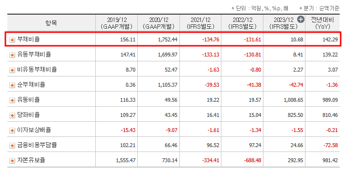 2023년 부채비율은 10.68%로, 전년(134.76%) 대비 급감했습니다. 이는 재무 구조가 개선되고 있으며, 부채 의존도가 낮아졌음을 의미합니다. 이는 향후 안정적인 경영 기반을 마련하는 데 중요한 역할을 할 것입니다.