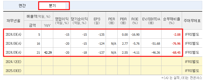 - 2024년 3분기: 매출액 21억 원, 영업손실 -20억 원
