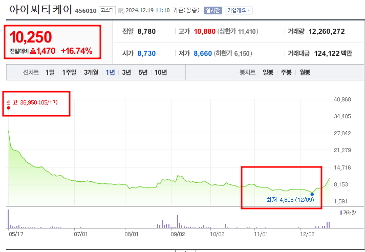 특히, 12월 9일 기록한 최저가 4,805원 대비 두 배 이상의 상승세를 보이며 단기적인 급등 흐름을 이어가고 있습니다.