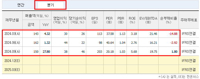2024년 분기별 실적에서는 매출이 안정적으로 증가하고 있으며, 3분기 영업이익 47억 원으로 수익성이 개선되고 있습니다.