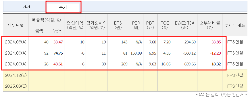 - 3분기(2024.09): 매출액 28억 원, 영업손실 -6억 원
