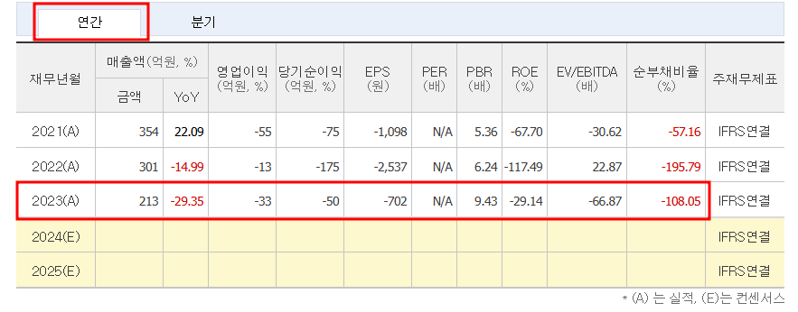 - 2023년: 매출액 213억 원, 영업손실 -33억 원, 순손실 -53억 원