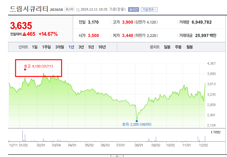 양자컴퓨터 관련주로 분류되어 금일 주가는 약 14% 오른 상태에서 거래되고 있습니다. 드림시큐리티의 주요 투자지표는 아래와 같습니다.