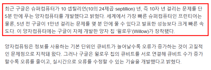 구글에서 개발한 양자컴퓨터는 10셉틸리언(10의 24제곱)년에 걸쳐서 풀어야 하는 문제를 단 5분만에 풀 수 있는 컴퓨터입니다. 현재 세계에서 가장 빠른 슈퍼컴퓨터인 프런티어보다 훨씬 빠른 속도입니다. 이번에 개발한 구글 양자컴퓨터에는 구글이 자체 개발한 양자 칩 '윌로우'가 장착되었습니다.