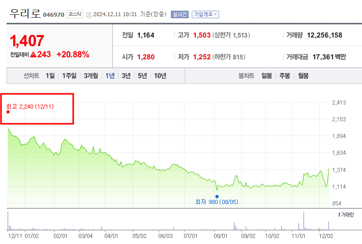 우리로는 초고속 통신에 필수적인 광분배기를 제작하고 판매하는 회사입니다. 역시 구글의 양자컴퓨터 개발 소식에 더불어 금일 주가는 약 20.88% 상승한 상태로 거래되고 있습니다. 우리로의 주요 투자 지표는 아래와 같습니다.