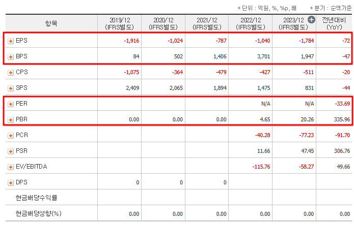 • EPS(주당순이익): 2024년 추정치 -1,784원