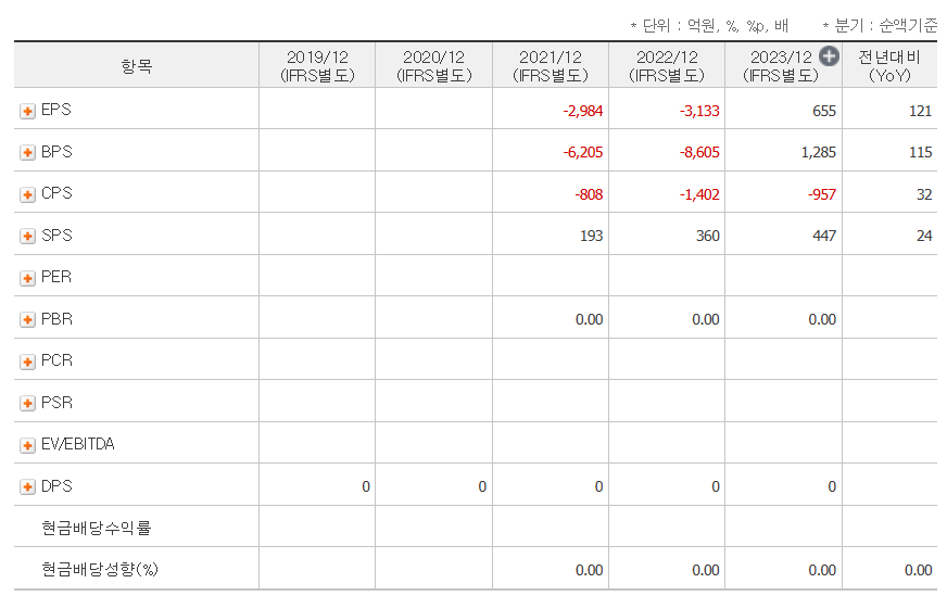 - EPS(주당순이익): 2023년 기준 655원으로 흑자 전환에 성공했습니다. 이는 전년 EPS(-3,133원) 대비 큰 폭의 개선을 이뤄낸 수치입니다.